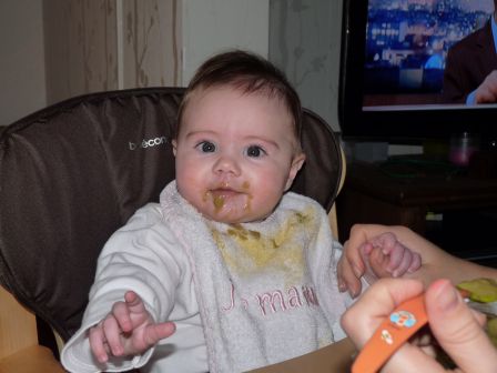 Carotte, petits pois, potiron, haricot vert sont les premiers légumes que j'ai gouté et depuis ce week-end, ce sont les fruits pommes-banane que j'ai decouvert. Ca fait maintenant deux semaines que mon déjeuner se compose de quelques cuillères de petit pot et encore d'un biberon de lait. Faut dire que ce n'est pas facile de manger à la cuillère.