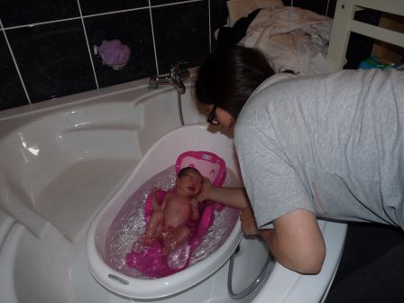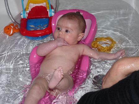 Maintenant que je tiens bien ma tête et tout mon corps, je prends mon bain dans la grande baignoire. On le fait uniquement le week-end car on profite de jouer avec mes nouveaux joujoux, ça prend du temps et ça m'amuse. J'ai même pas besoin du soutien de maman avec mon transat de bain mais elle n'est pas loin, je suis encore trop petite.